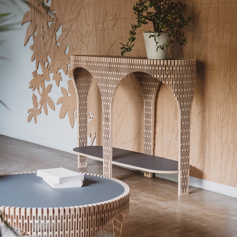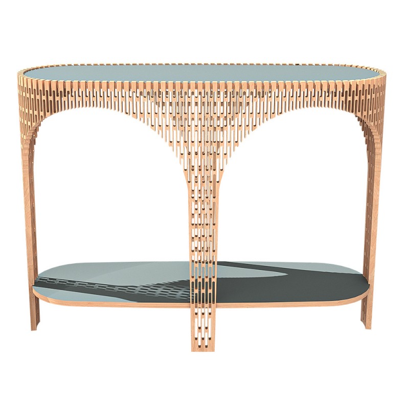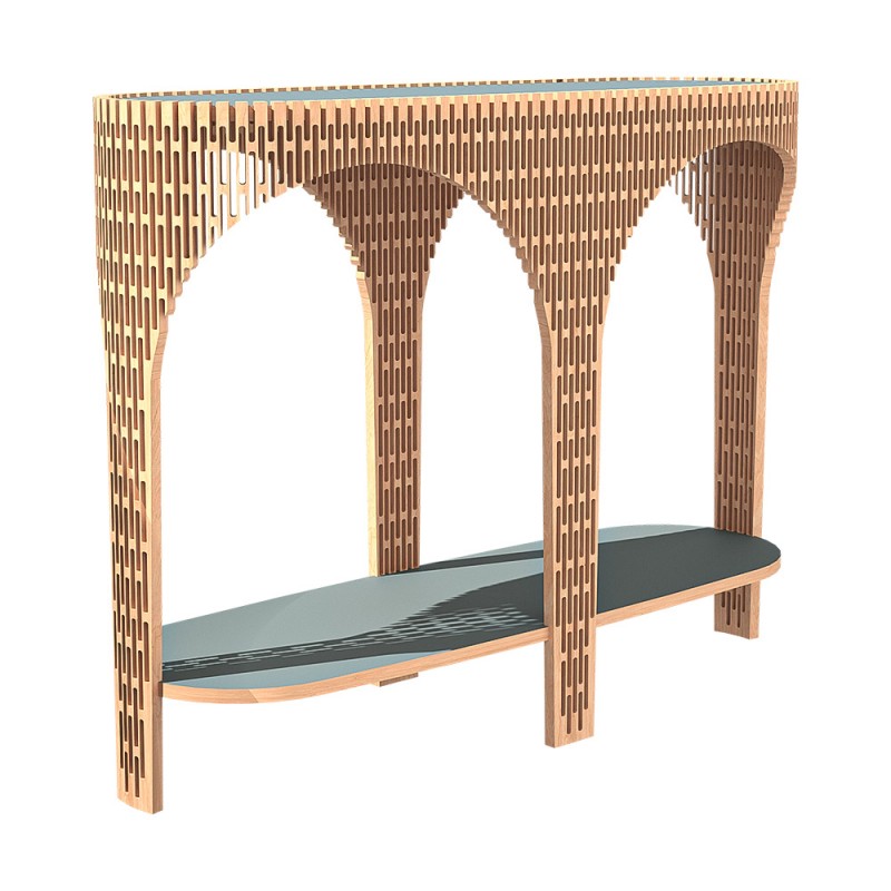La console Massimo s’inspire de l’hippodrome antique du Circus Maximus et transpose son tracé monumental en mobilier contemporain.