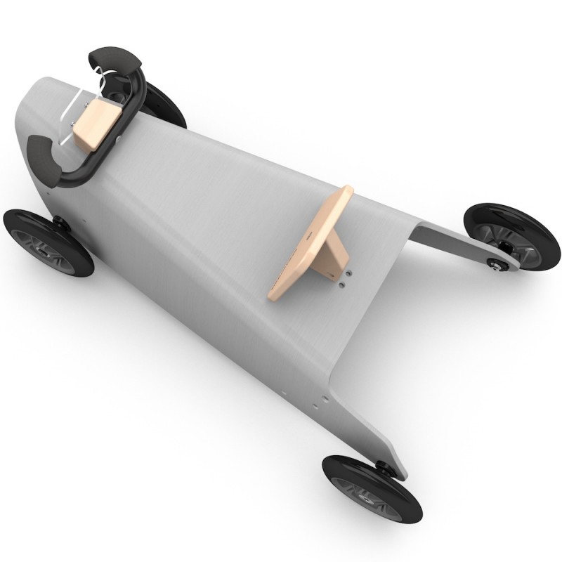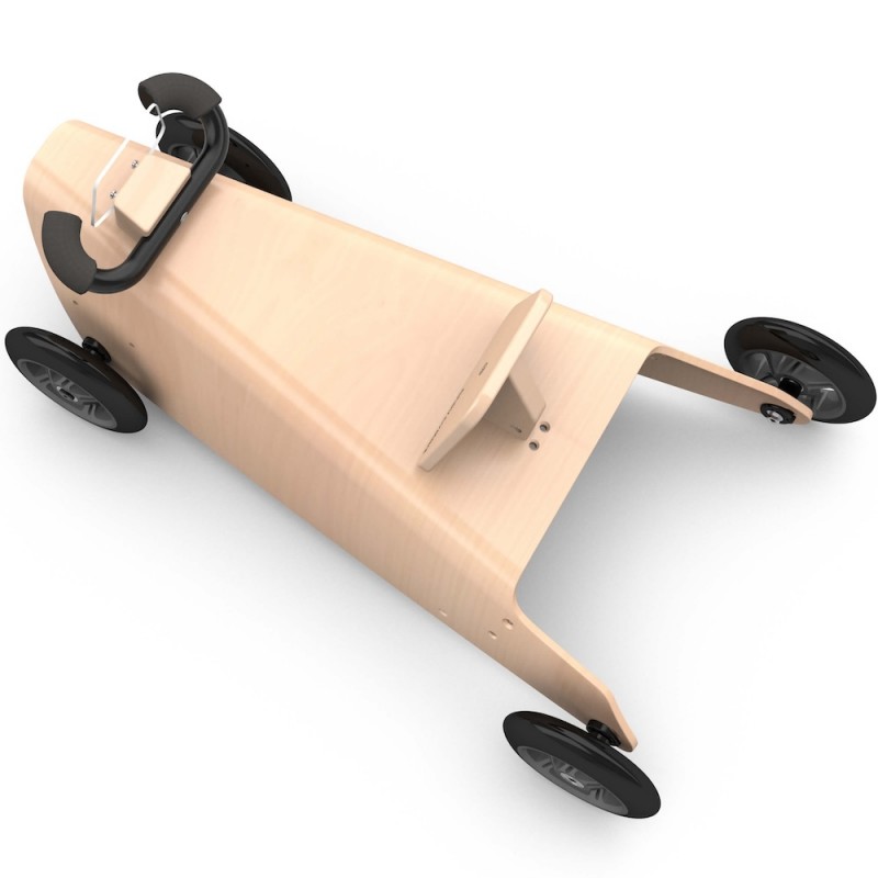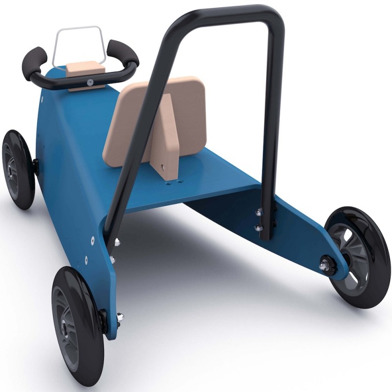 - 4 roues silencieuses à roulements à billes de précision ne laissant pas de traces sur les sols, positionnées pour ne pas gêner le mouvement des jambes de l’enfant.