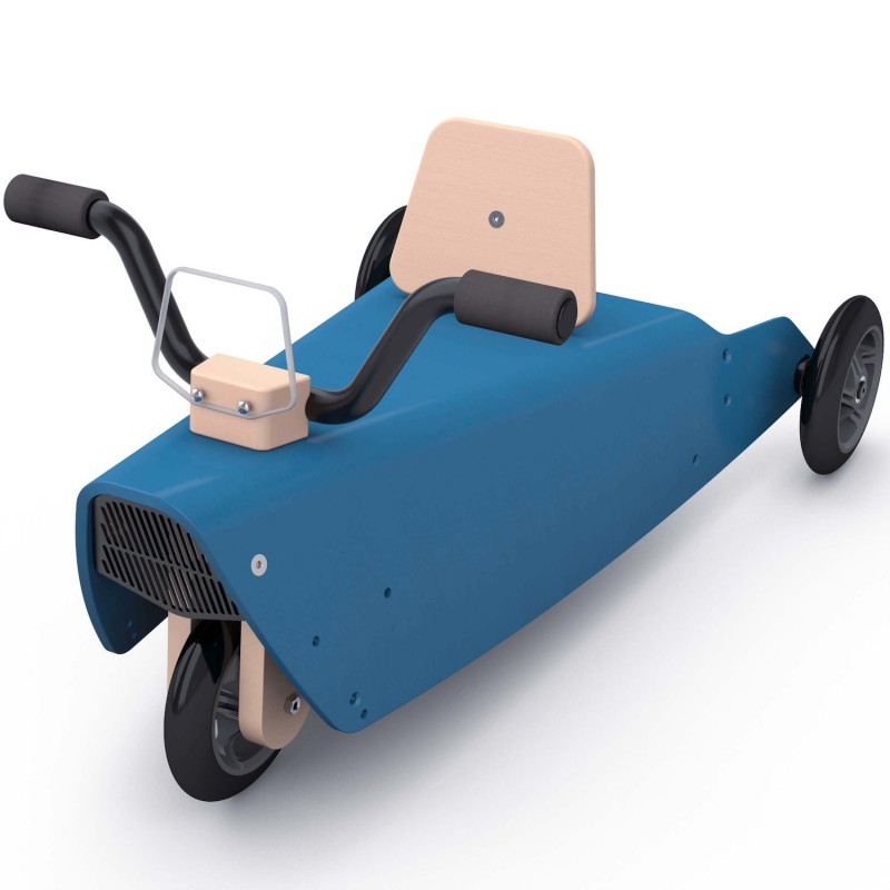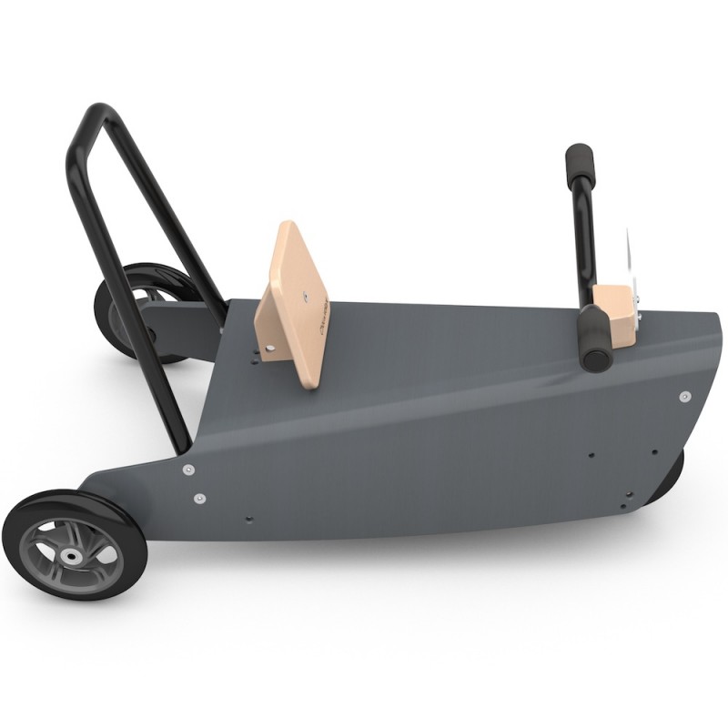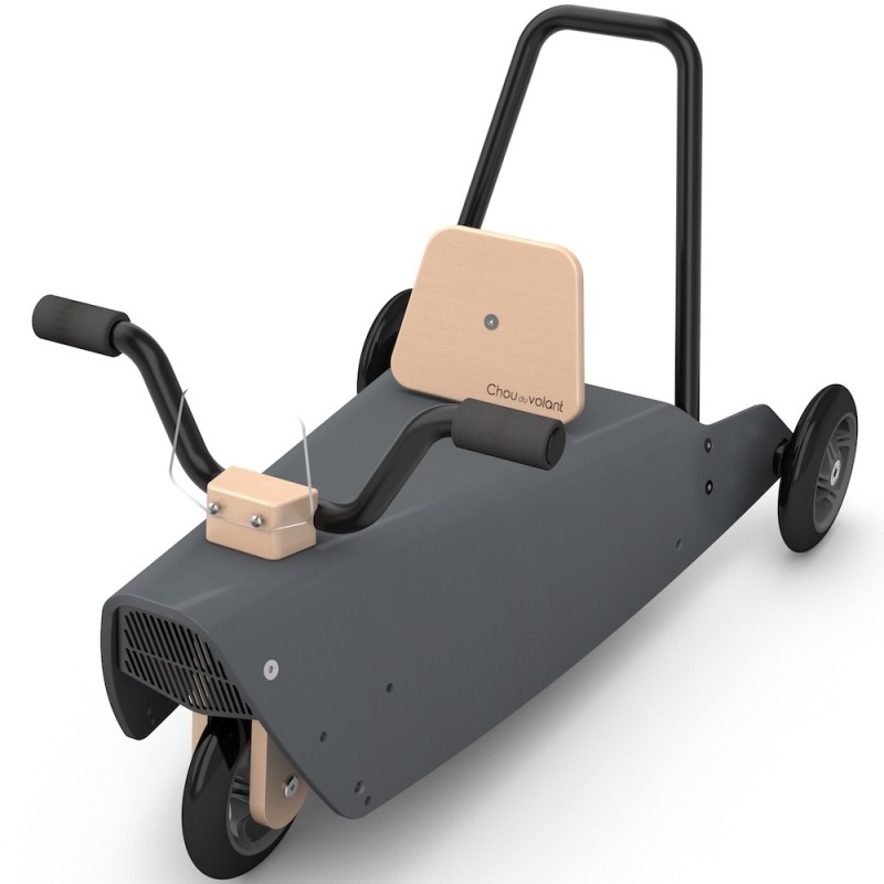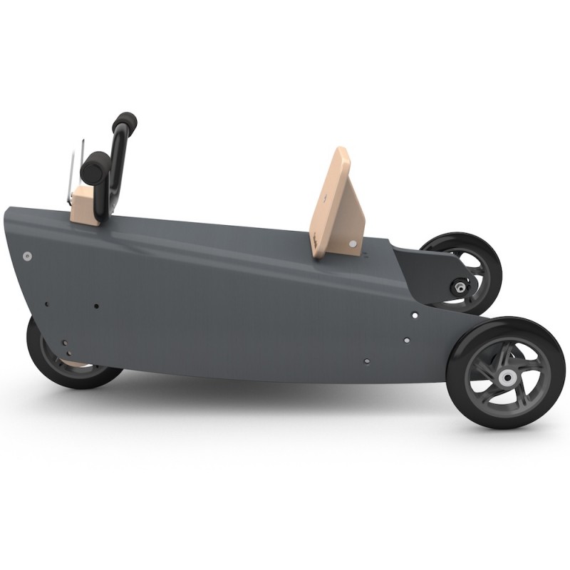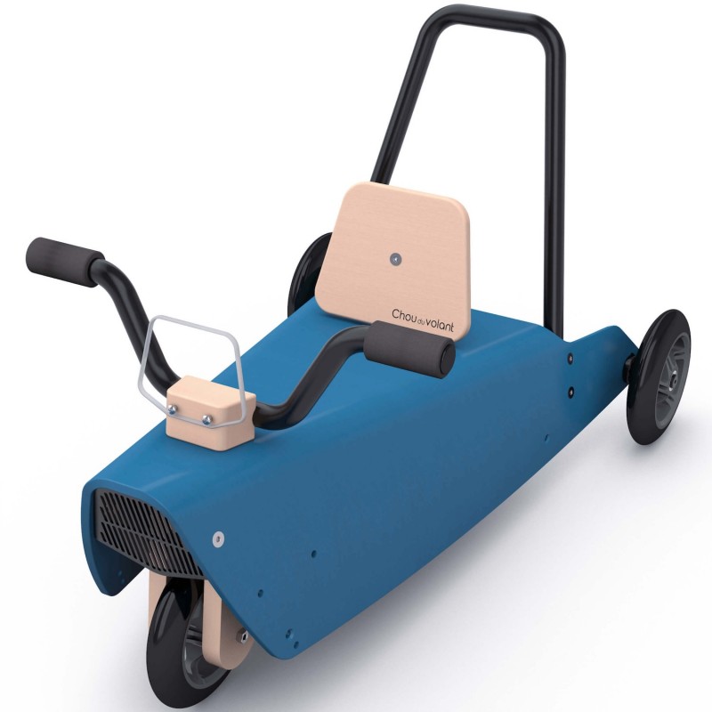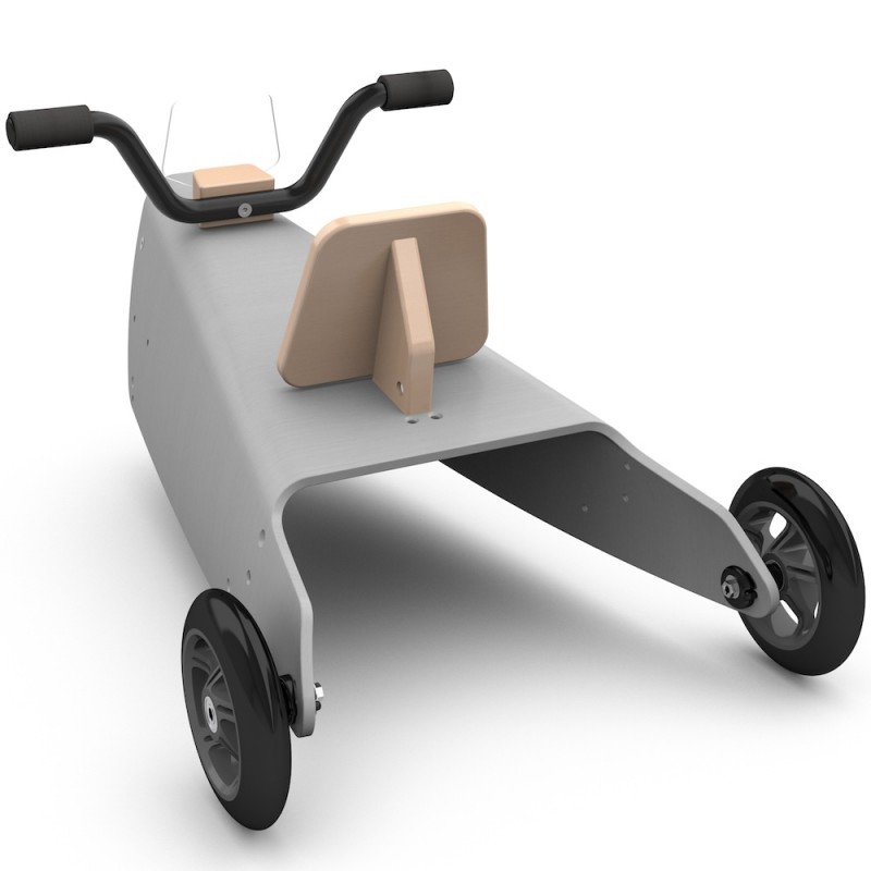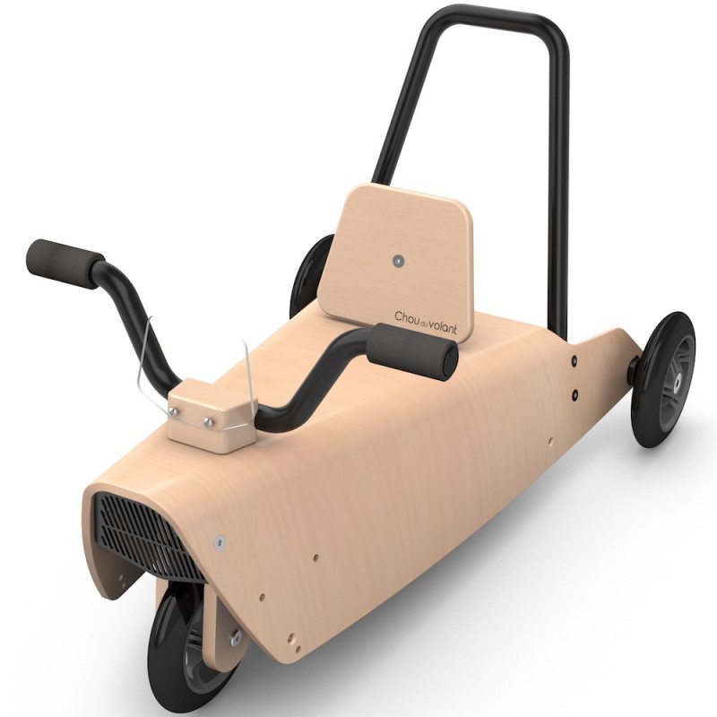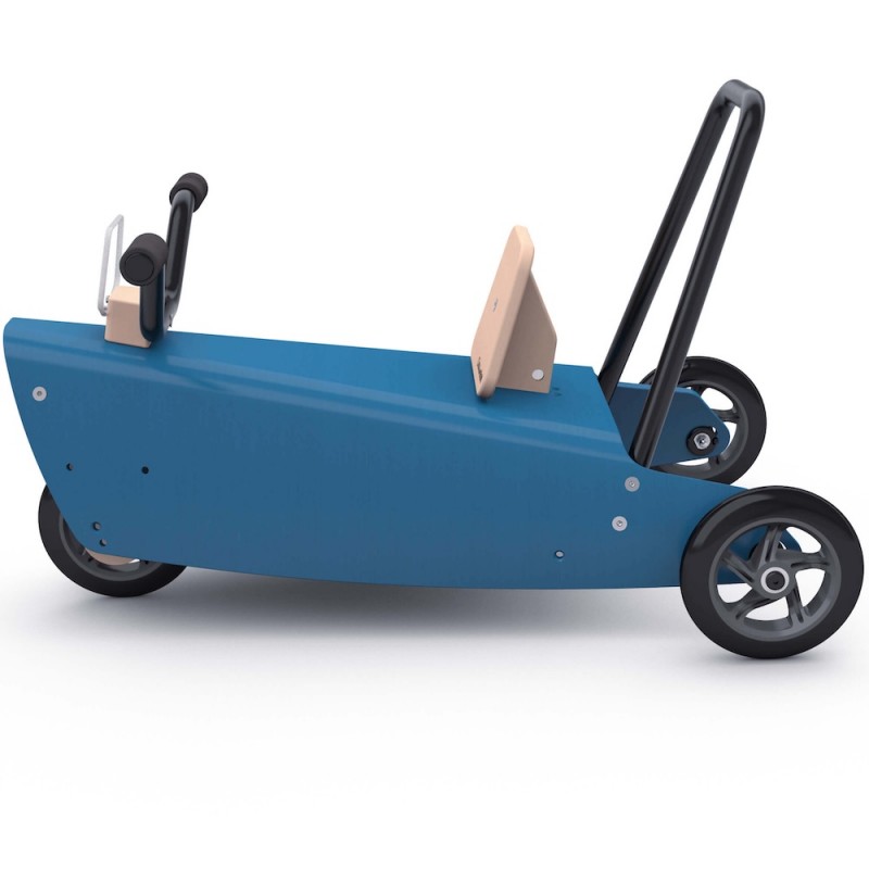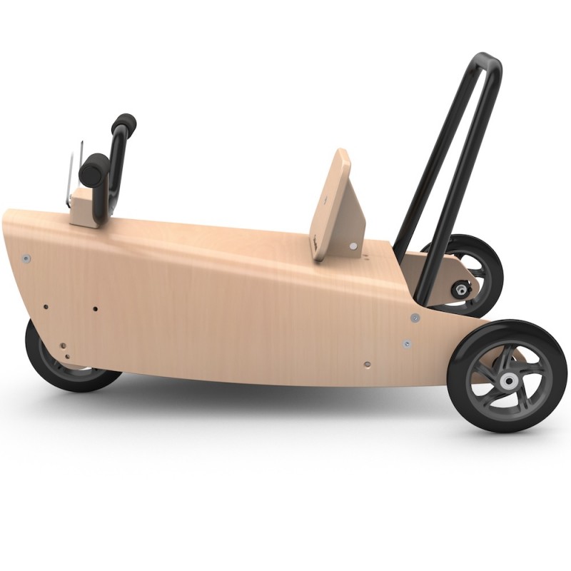 Il constitue aussi un porteur bébé : le guidon relié à la fourche directionnelle permettant à l'enfant de se diriger en toute liberté. Ce jouet design en bois peut également être utilisé, grâce à son arceau arrière démontable, comme un jouet à pousser et permettre ainsi à plusieurs enfants de jouer ensemble.