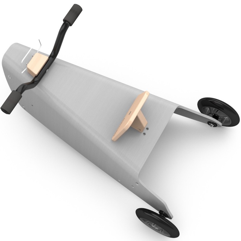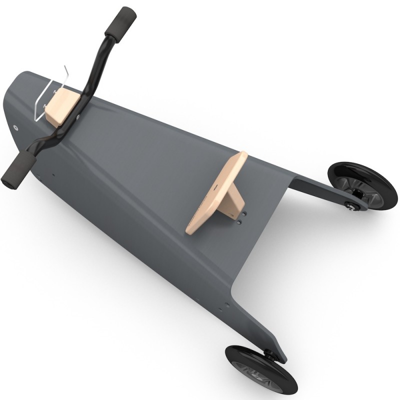 - Platine de direction, dossier pour l’assise, deux patins réversibles bascule, une fourche avant directionnelle (mobile, avec une butée afin de limiter l'angle de braquage), une fourche arrière fixe en hêtre massif issu de forêts françaises gérées durablement.