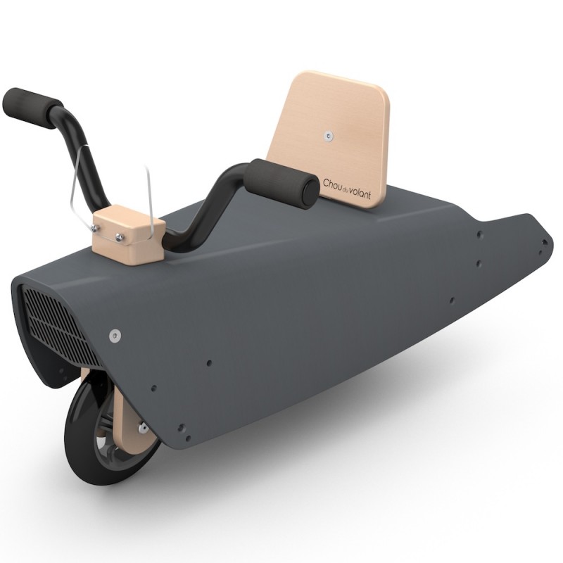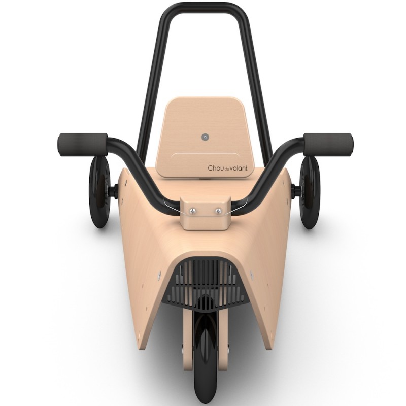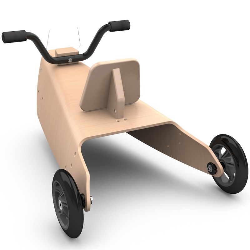 Enfin, l'enfant grandissant, ce jouet peut se transformer en une draisienne moto en remplaçant simplement les 2 roues arrière du porteur par une seule roue centrale munie d'une fourche en bois massif.