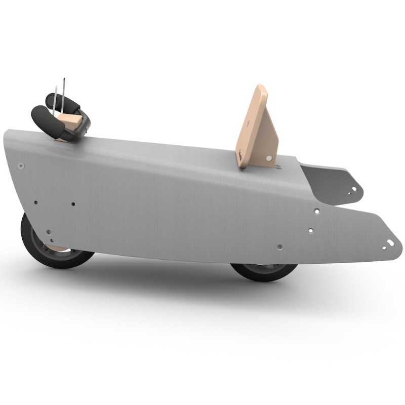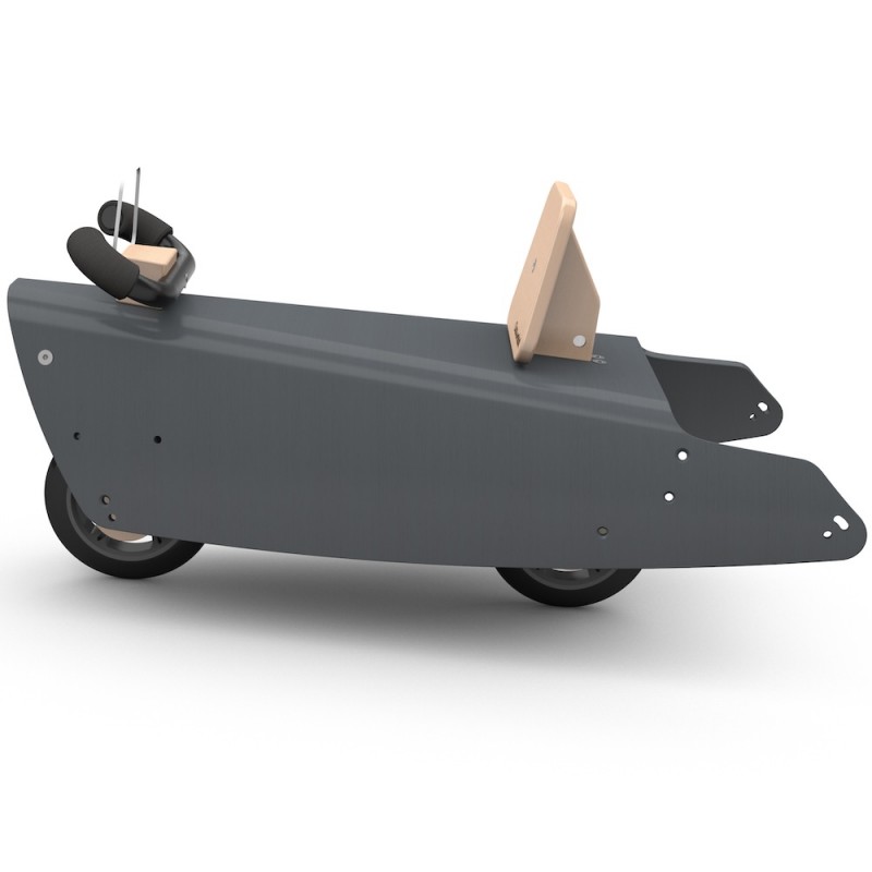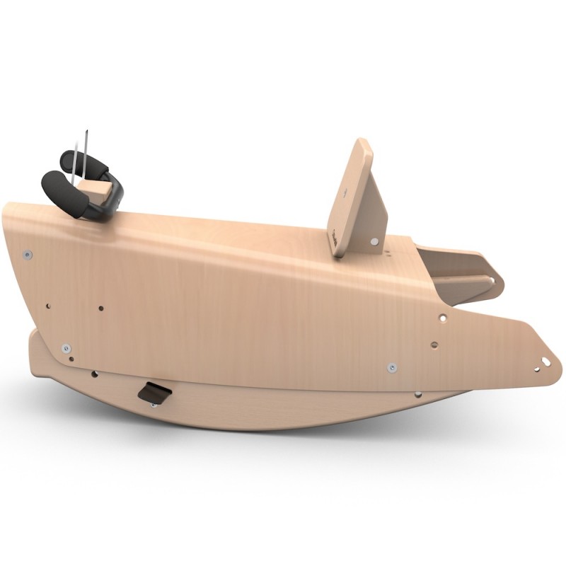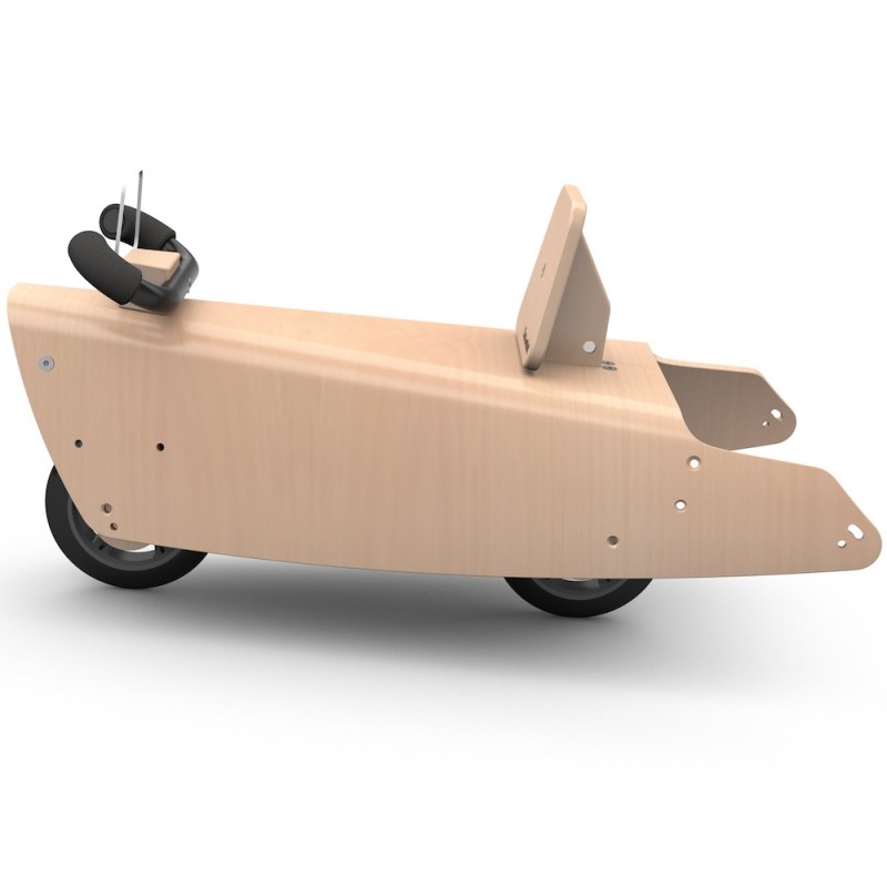 - Platine de direction, dossier pour l’assise, deux patins réversibles bascule, une fourche avant directionnelle (mobile, avec une butée afin de limiter l'angle de braquage), une fourche arrière fixe en hêtre massif issu de forêts françaises gérées durablement.