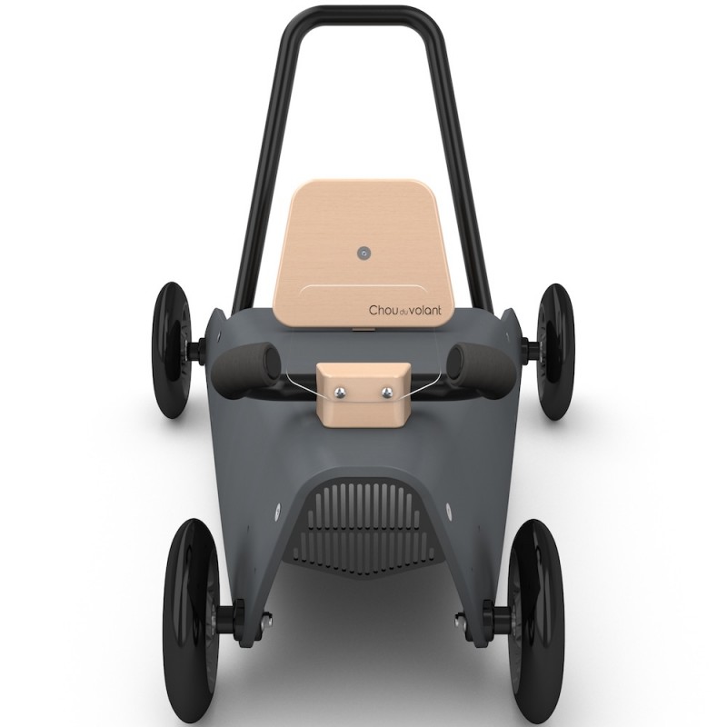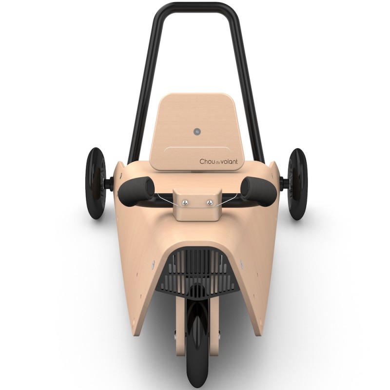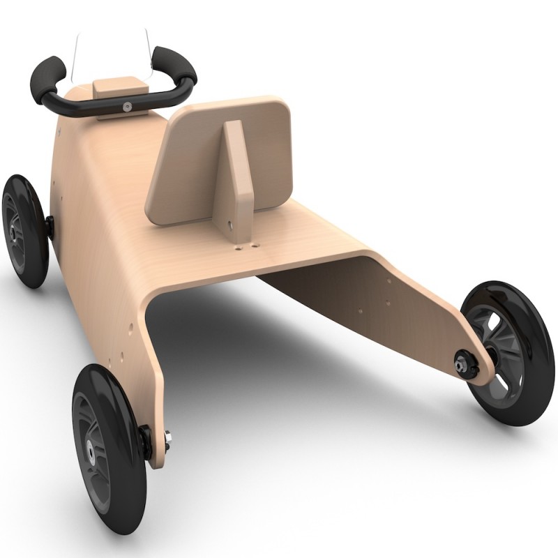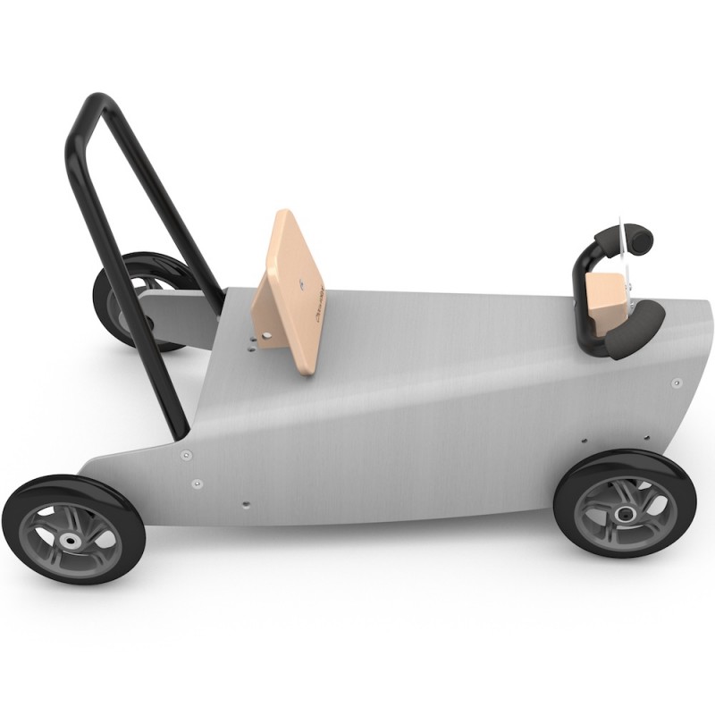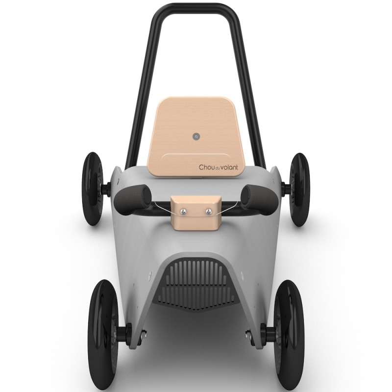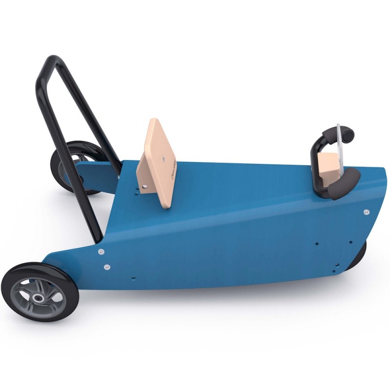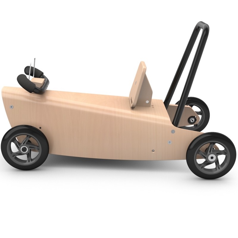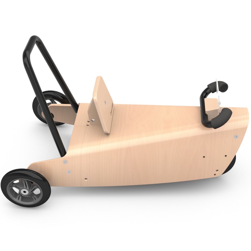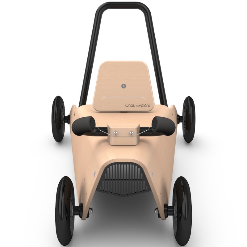 Il constitue aussi un porteur enfant à 4 roues (direction fixe) et à 3 roues (avec volant directionnel relié à une fourche mobile en bois), afin de permettre à l'enfant d'expérimenter des sensations différentes en matière de mobilité. Ce jouet design en bois peut également être utilisé, grâce à son arceau arrière démontable, comme un jouet à pousser et permettre ainsi à plusieurs enfants de jouer ensemble.