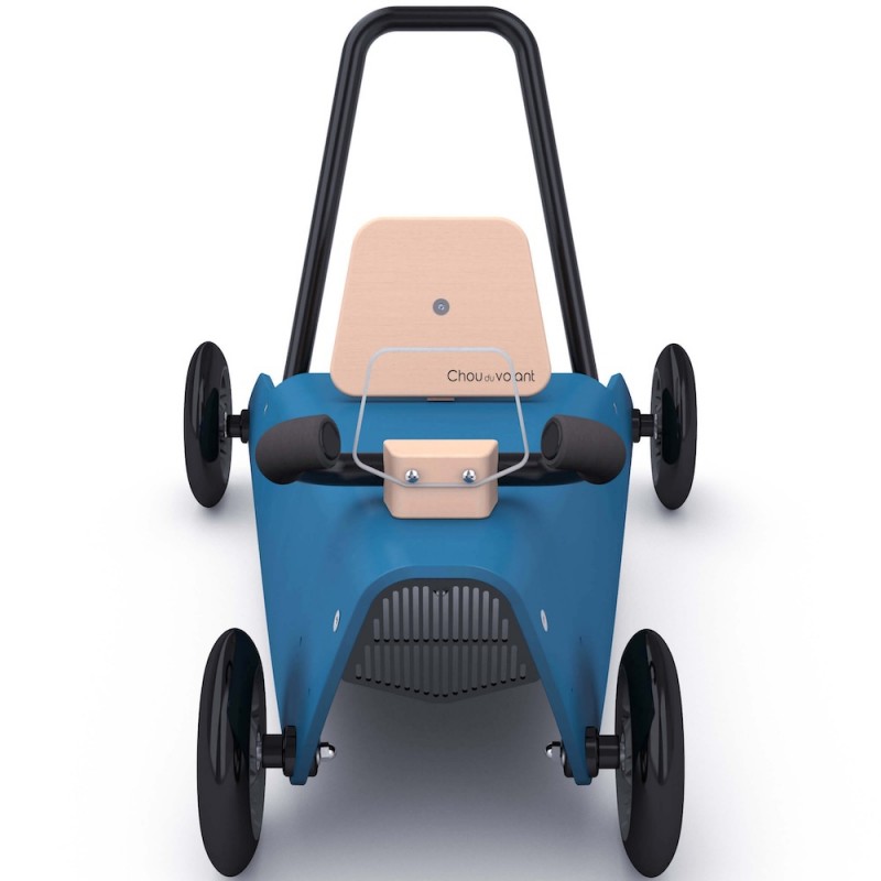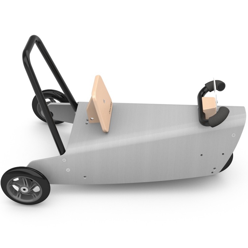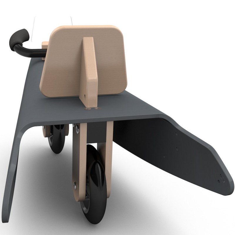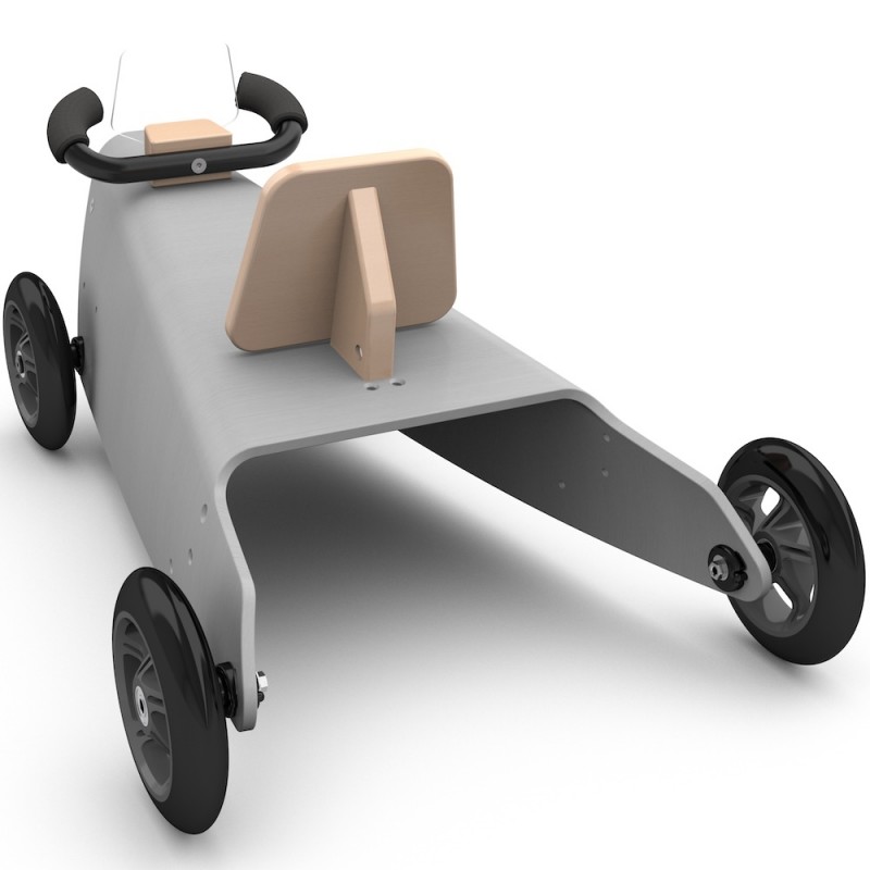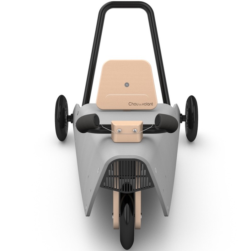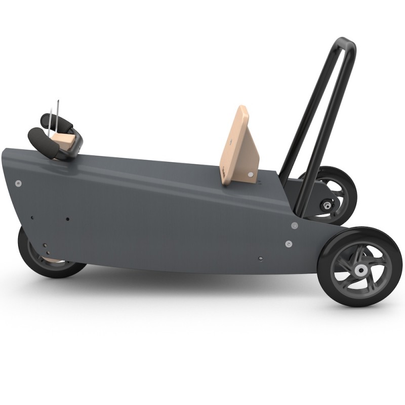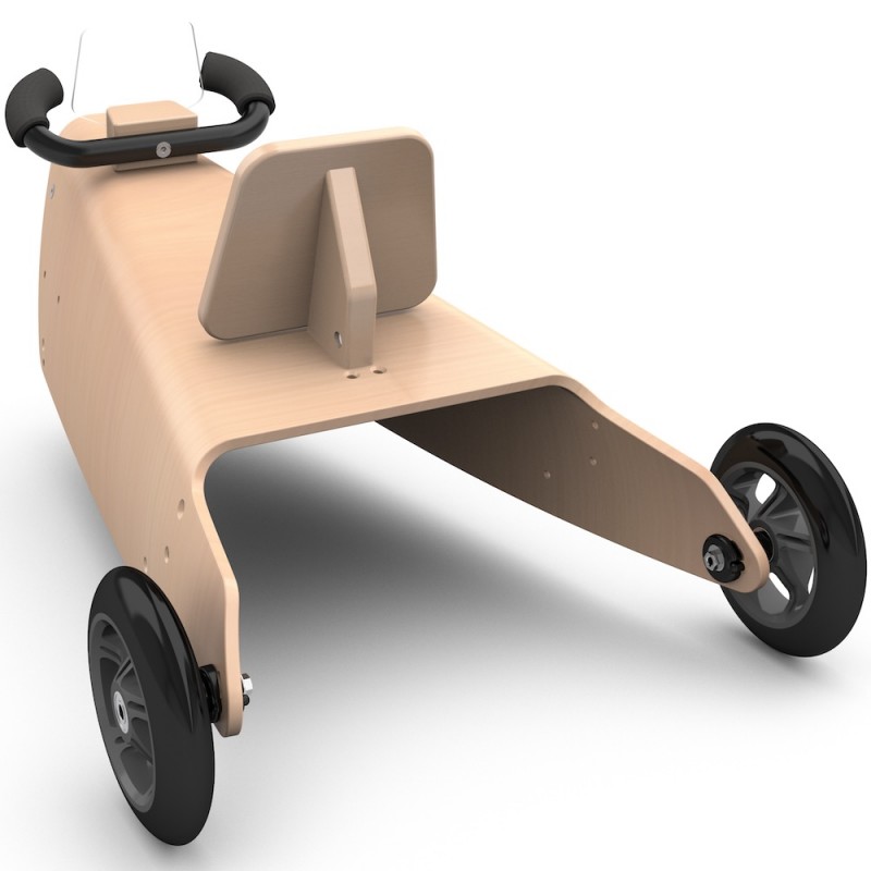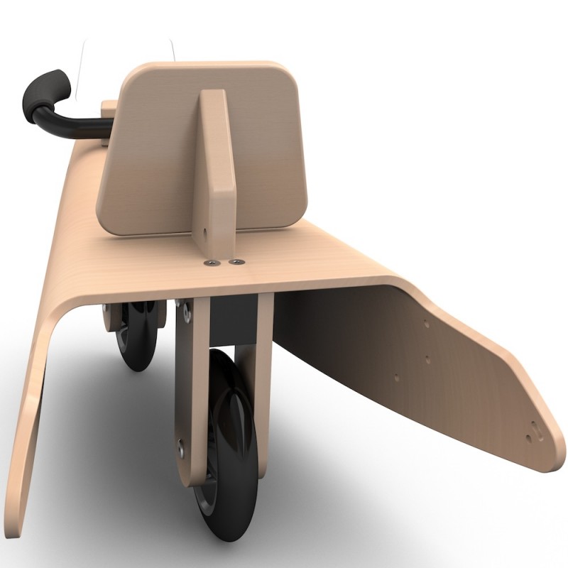 Il constitue aussi un porteur enfant à 4 roues (direction fixe) et à 3 roues (avec volant directionnel relié à une fourche mobile en bois), afin de permettre à l'enfant d'expérimenter des sensations différentes en matière de mobilité. Ce jouet design en bois peut également être utilisé, grâce à son arceau arrière démontable, comme un jouet à pousser et permettre ainsi à plusieurs enfants de jouer ensemble.