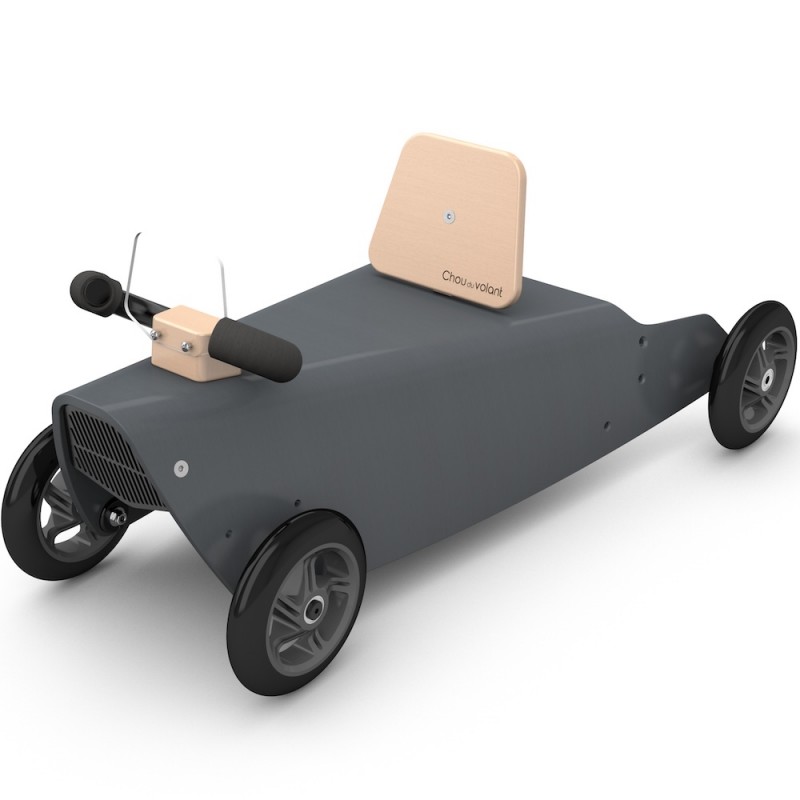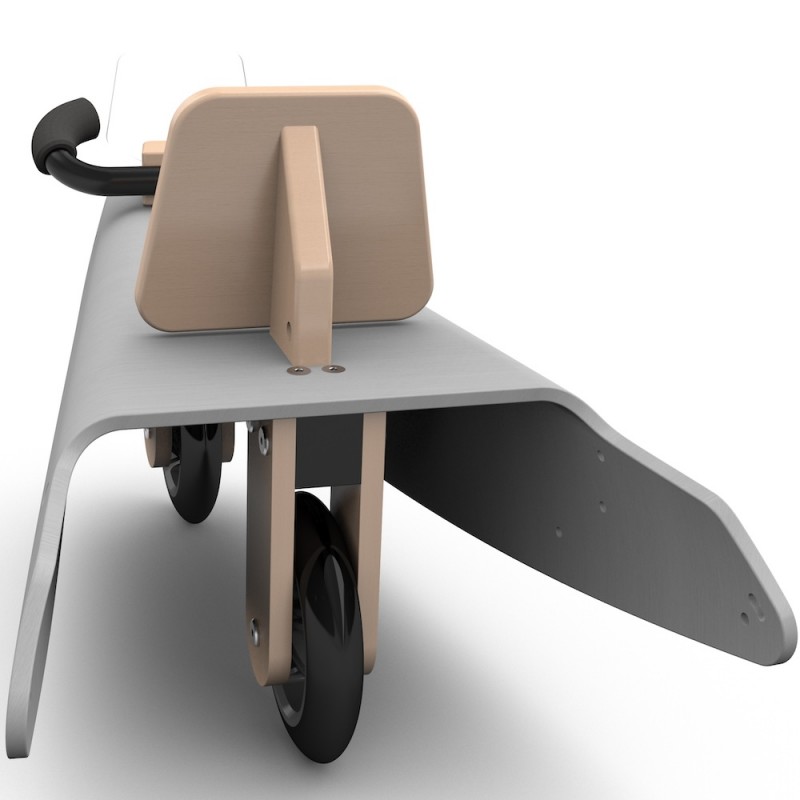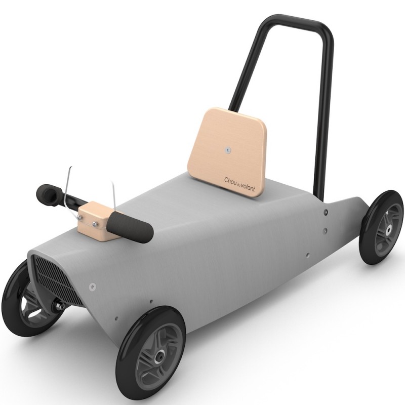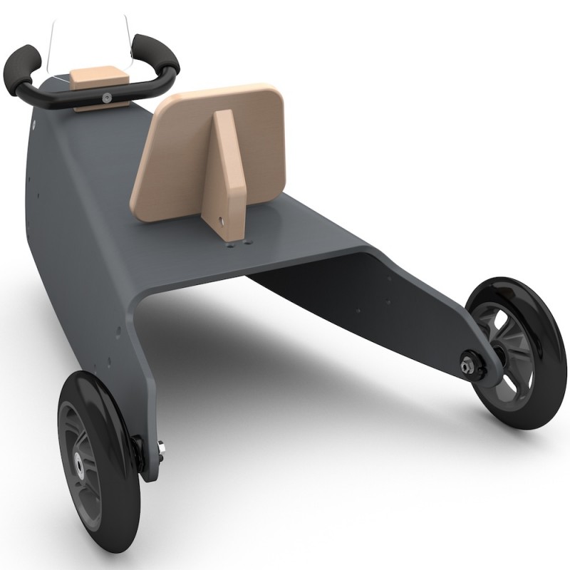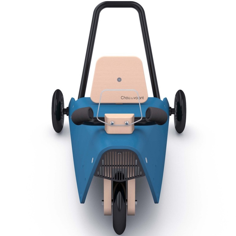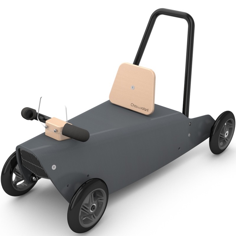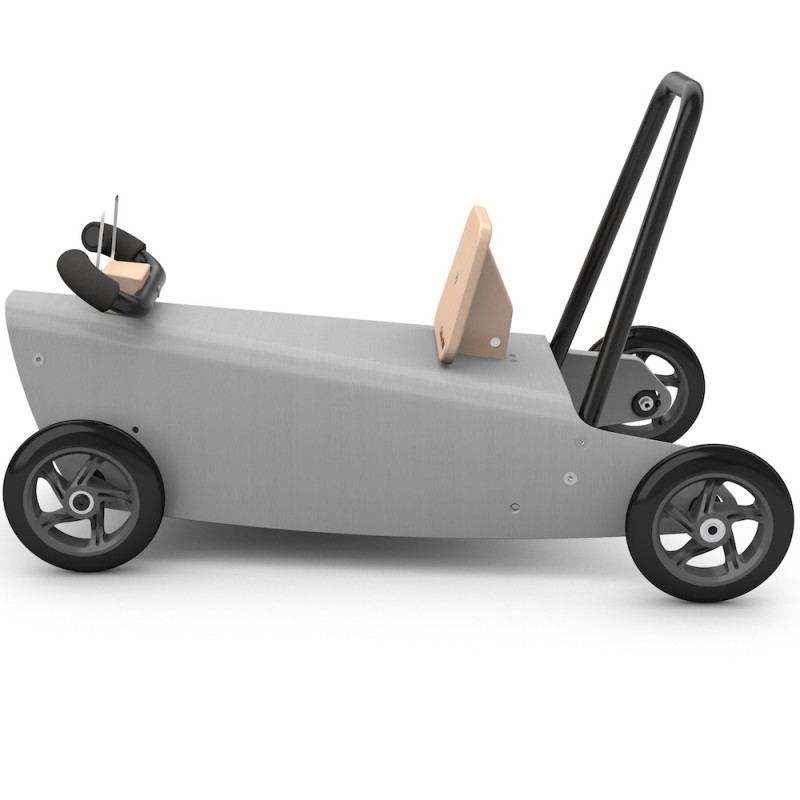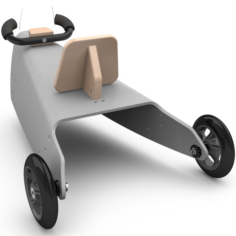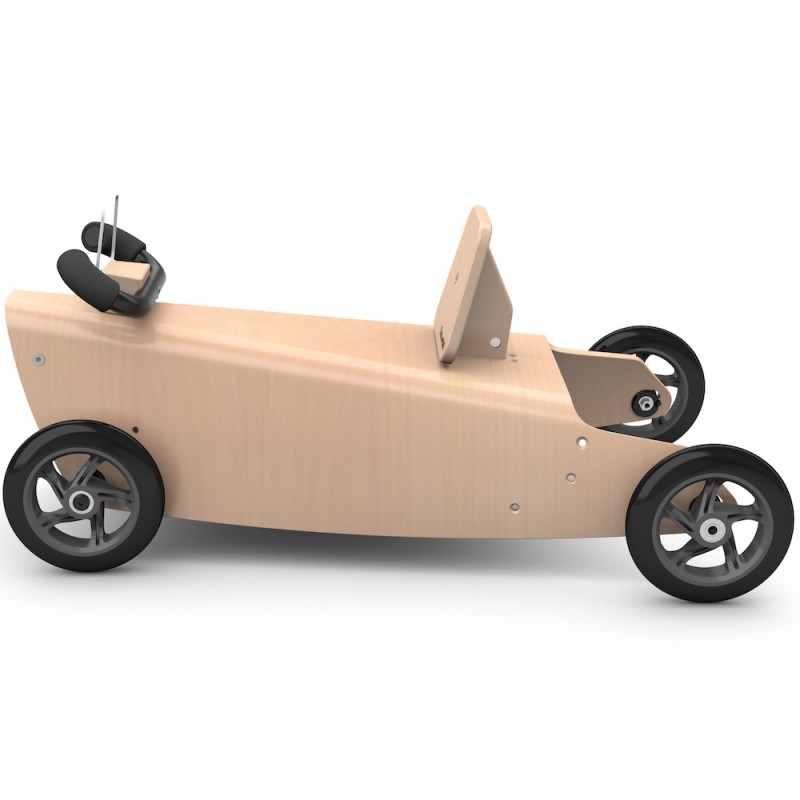 Il constitue aussi un porteur enfant à 4 roues (direction fixe) et à 3 roues (avec volant directionnel relié à une fourche mobile en bois), afin de permettre à l'enfant d'expérimenter des sensations différentes en matière de mobilité. Ce jouet design en bois peut également être utilisé, grâce à son arceau arrière démontable, comme un jouet à pousser et permettre ainsi à plusieurs enfants de jouer ensemble.