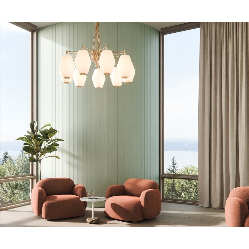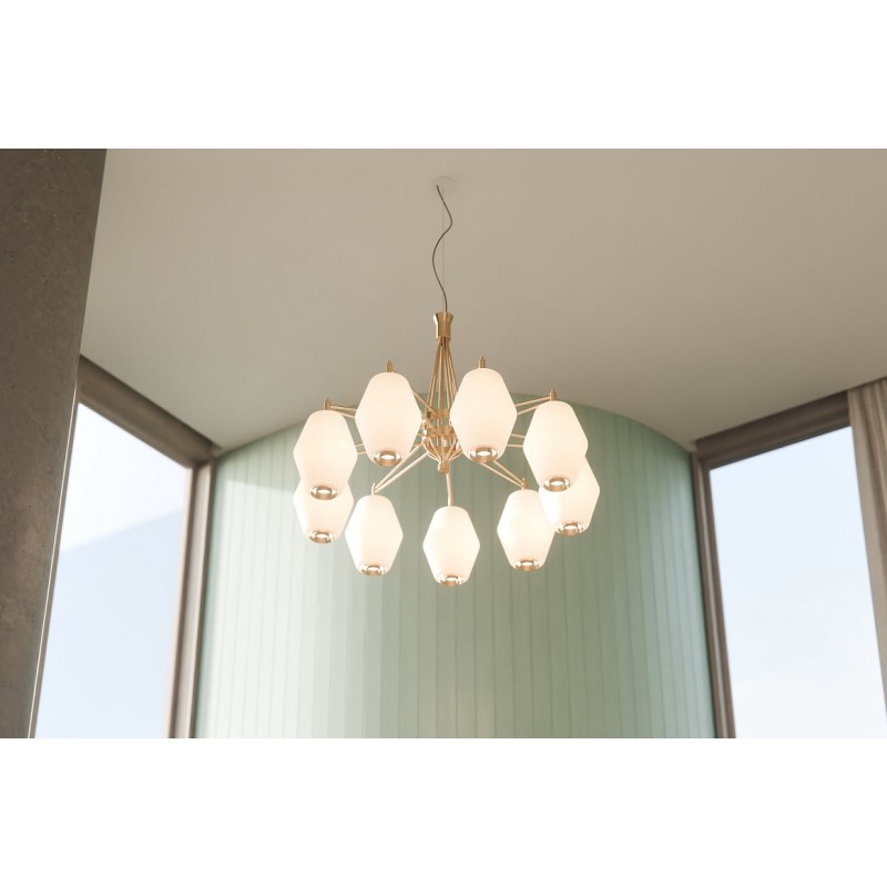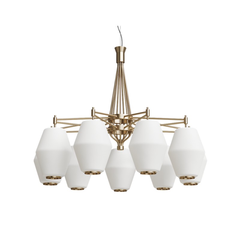 Ce lustre réédité reste fidèle à la vision du milieu du siècle dernier tout en s'adaptant à la vie contemporaine. Des globes en verre soufflé bouche diffusent une douce lumière dans la pièce, tandis que des détails en laiton apportent une touche de raffinement.