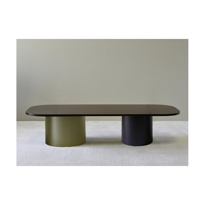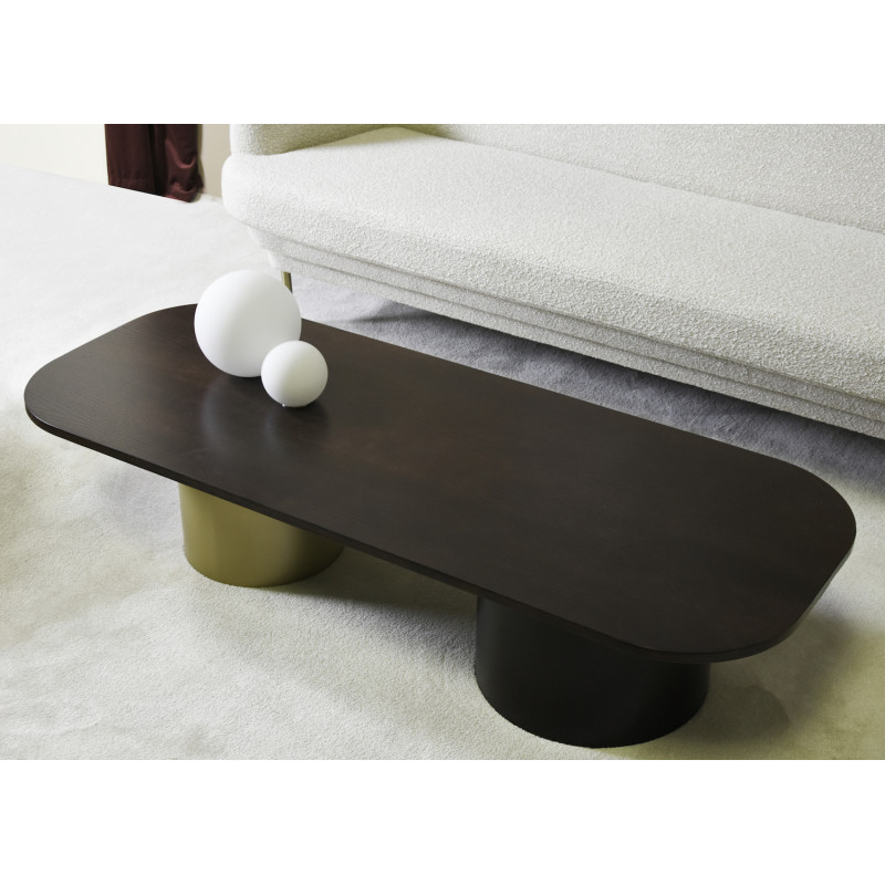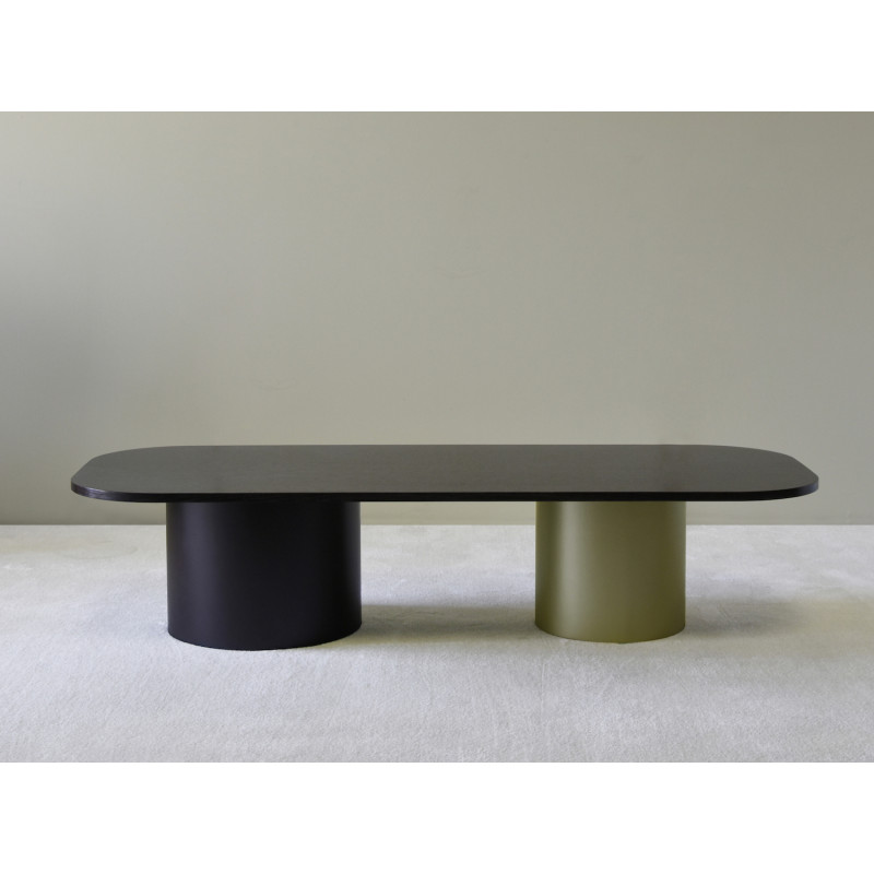 Le plateau en chêne sombre et les deux pieds aux finitions et diamètres différents permettent un subtil mélange entre intemporalité et originalité.